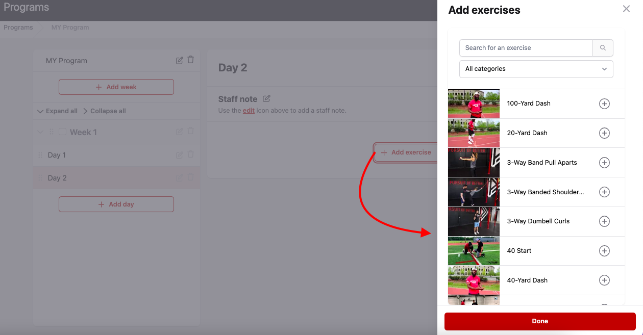 - Choose a desired day and use the Add Exercise button to start adding exercises to your workout