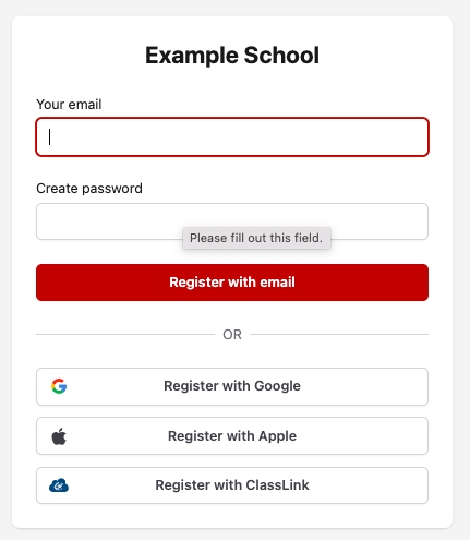 Next, they can choose to enter their email and password, or use one of the Single-Sign-On features provided (Google, Apple, Classlink).