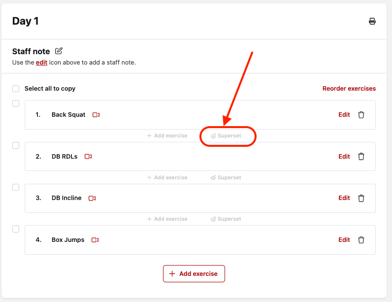 Between exercises, you will see an "Superset" icon. Select it to pair the exercises above and below it:
